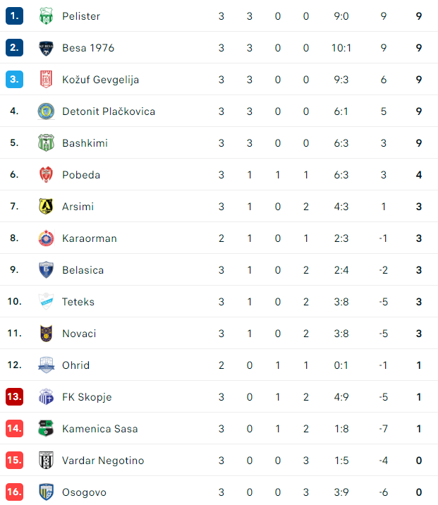 Со максимален учинок има уште четири екипи и тоа се Беса, Кожуф, Детонит и Башкими. Разликата меѓу овие и Пелистер е тоа што битолчани се единствени кои немаат примено ниту еден гол досега.