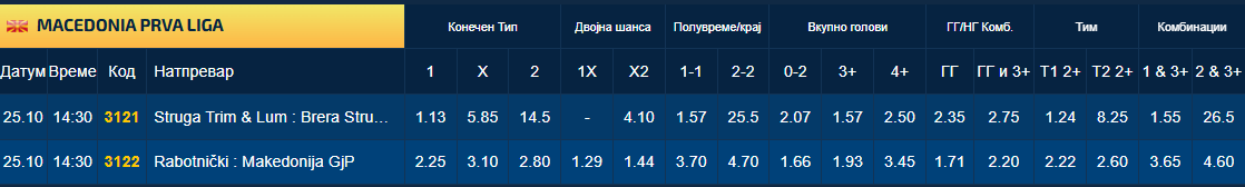 Струга Трим Лум е голем фаворит за победа против Брера Струмица, а Работнички е благ фаворит на хартија против Македонија Ѓорче Петров, во денешните два натпревари од Првата македонска фудбалска лига кои се играат од 14.30 часот.