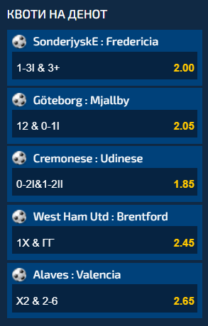 Денешните пет меча кои се дел од понудата во Квотите на денот доколку се уплатат заедно на еден тикет, носат вкупен коефициент од 49.24. Во првенството на Данска, Сондерјиске е домаќин на Фредерика и тука може да се одигра на голови. Потребо е да има од еден до три гола во првото полувреме, а на крајот да биде 3+ со погодоци за да биде добитна квотата од точно два.