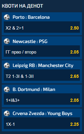 Петте меча кои се дел од Квотите на денот се од елитната програма во Лигата на шампионите, а ако ги одиграте сите пет заедно на еден тикет, ќе добиете вкупен коефициент од 62.64.