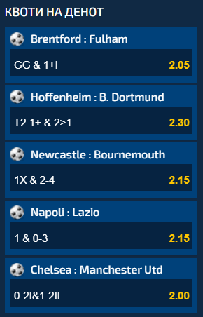 Брентфорд и Фулам треба да си постигнат барем по еден гол, а најмалку еден погодок треба да има во првото полувреме, за да биде добитна комбинацијата која се вреднува со коефициент од 2.05.
