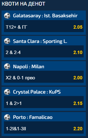 Понудената квота од 2.05 за мечот на Галатасарај и Истанбул Башакшехир ќе биде добитна само ако домашните постигнат најмалку два гола, но барем и еден гол да примат.