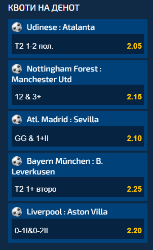 Пет меча од Топ 4 лигите во Европа се дел од Квоти на ден, а ако сите комбинации се одиграат заедно на еден тикет, вкупниот коефицинет кој се добива е 45.81. Удинезе е домаќин на Аталанта, а гостинот да постигне еден до два погодоци во првиот дел е со квота од 2.05.