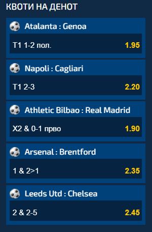По два меча од Италија и Англија и една пресметка од Шпанија се во понудата на денешните Квоти на ден. Доколку сите пет понудени комбинации ги одиграте заедно на еден тикет, вкупниот коефициент кој ќе го добиете е 46,92.