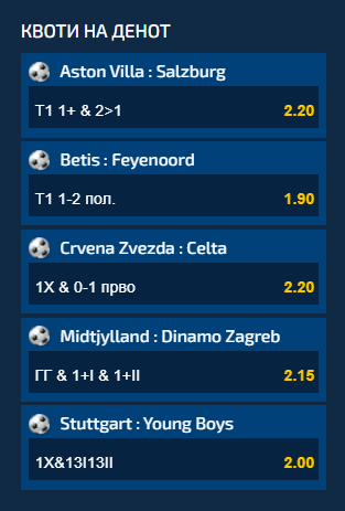 За средбата на Црвена ѕвезда и Селта, предлогот е да уплатите дека домашните нема да загубат и притоа во првото полувреме не смее да има повеќе од еден гол. Квотата за оваа комбинација е 2.20.