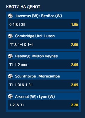 Првиот предлог е мечот во женската Лига на шампиони меѓу Јувентус и Бенфика, а квотата на денот е 1.95 ако во првото полувреме биде постигнат најмногу еден гол, а во второто од еден до три гола.
