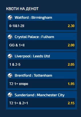 Брентфорд се среќава со Тотенхем и квотата на денот е 1.95, ако гостите постигнат најмалку еден гол во второто полувреме.