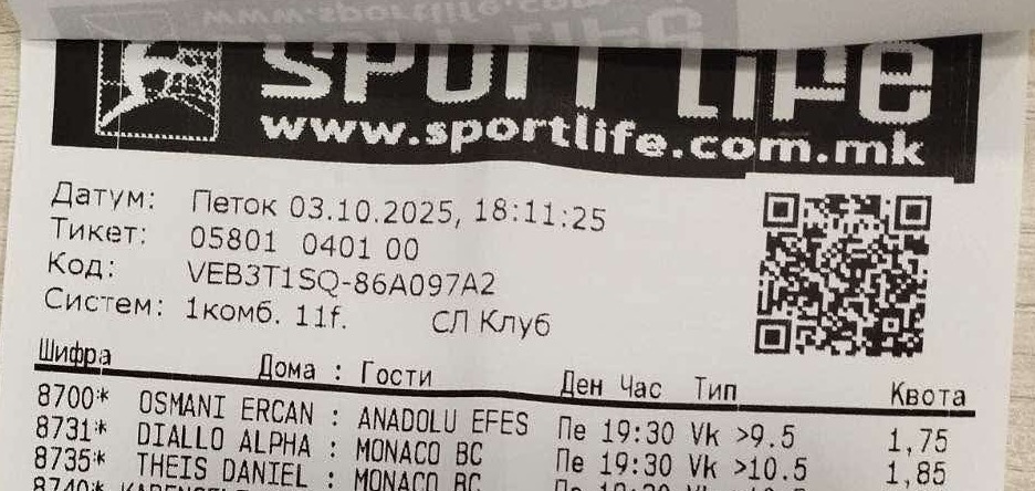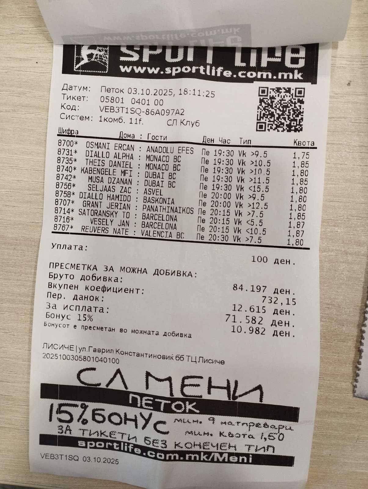 На тикетот се одиграни 11-мина кошаркари, од кои осуммина требаше да постигнат повеќе поени од понудената граница, додека тројца помалку. Вложени беа само 100 денари, а добивката е фантастична, дури 71.582 денари нето.