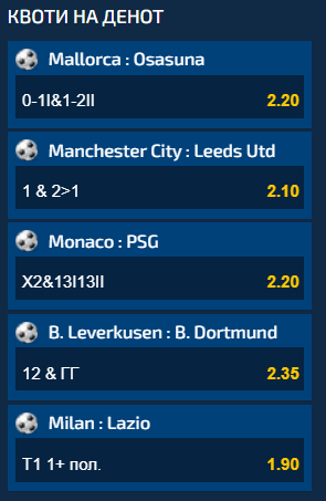По еден меч од Топ 5 лигите во Европа се во комбинација на Квоти на ден, а ако сите пет понудени опции се одиграат заедно на еден тикет, вкупниот коефиицнет кој ќе го добиете за евентуална добивка е 45,38.