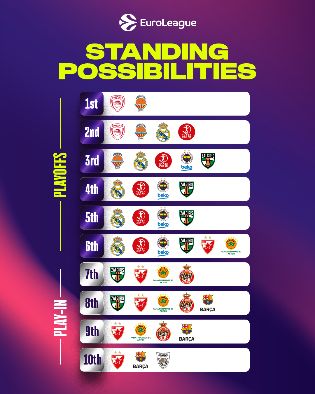 Последното коло во кошаркарската Евролига ќе ги реши сите дилеми околу тоа кои екипи ќе одат директно во плејофот, а кои во плејин-разигрувањето, како и кои екипи ќе имаат предност на домашен терен во четвртфиналето.