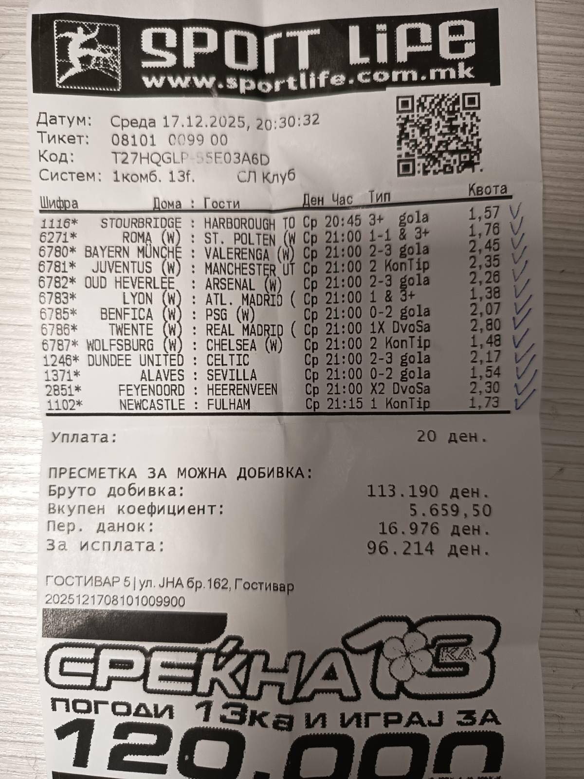 Но, овој обложувач на потешкиот начин научи една важна лекција, дека кога се уплаќа тикет со 13 пара, подобро е сите квоти да бидат 1.40 или поголеми и да учествува во Среќна 13-ка, што кај него не беше случај. На мечот помеѓу женските тимови на Лион и Атлетико Мадрид, квотата е 1,38 и само за 0,02 не влезе во комбинација за месечната награда од 120 илјади.