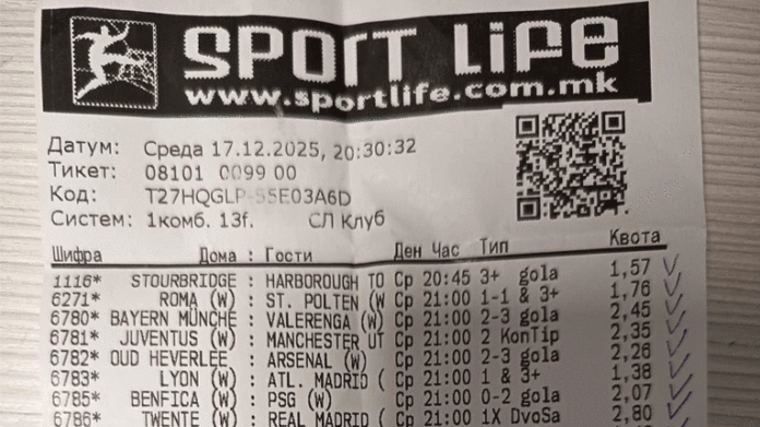 Во Sport Life во Гостивар синоќа е уплатен добитен тикет со 13 погодени пара и вкупна добитна квота дур од 5.659, но овој гостиварец испушти шанса да биде главен кандидат и за дополнителни 120.000 денари.