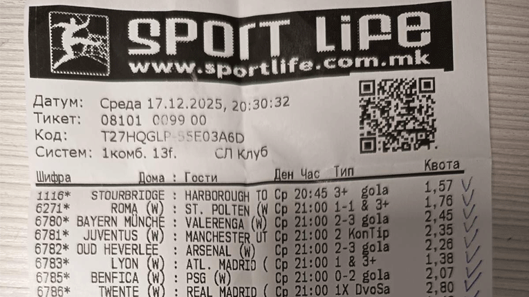Но, овој обложувач на потешкиот начин научи една важна лекција, дека кога се уплаќа тикет со 13 пара, подобро е сите квоти да бидат 1.40 или поголеми и да учествува во Среќна 13-ка, што кај него не беше случај. На мечот помеѓу женските тимови на Лион и Атлетико Мадрид, квотата е 1,38 и само за 0,02 не влезе во комбинација за месечната награда од 120 илјади.