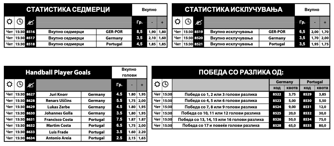 Германија ја има фаворитската улога со квота од 1.95, додека победа на Португалија има квота од 2.21.