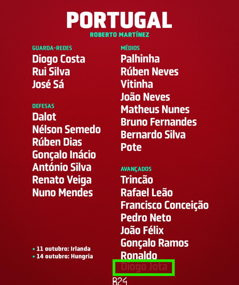 Тоа што сите ги изненади е дека селекторот Мартинез на листата на играчи го додаде и името на Диого Жота, кој за жал пред два месеци загина во сообраќајна несреќа. Жота заедно со својот брат Андре Силва патуваа со автомобил кога излетаа од патот, колата се запали и двајцата загинаа.