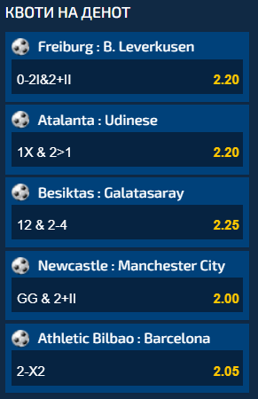 Фрајбург е домаќин на Баер Леверкузен и тука во првото полувреме не треба да има повеќе од два гола, додека во вториот дел треба да бидат постигнати 2+ погодоци, за да биде добитна квотата од 2.20.