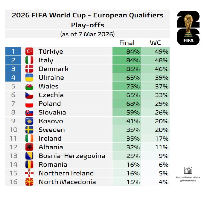 Шансите за две победи и пласман на Мундијалот се уште помали, само 4%, а најголем фаворит за пласман во САД, Канада и Мексико има Турција (49%). Нашиот противник во првиот бараж, Данска, има 46% веројатност дека ќе ги добие двата меча.