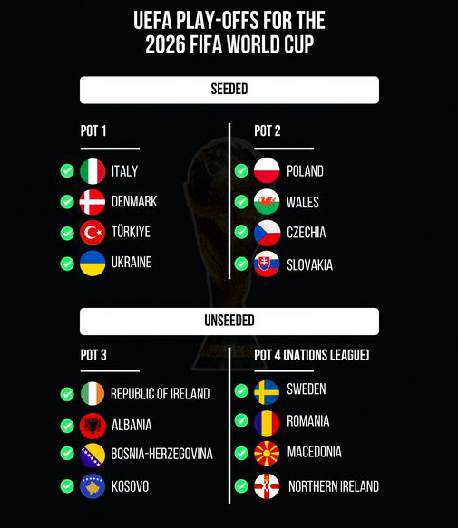 Македонија го очекува својот противник во полуфиналето од европскиот бараж, за кој е јасно дека ќе го играме на гостински терен, додека местото на одигрување на евентуалното финале ќе биде одлучено со ждрепка.