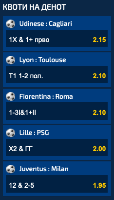Јувентус и Милан играат во дербито на колото во италијанската Серија А, а според сите очекувања во Торино вечерва ќе има победник. Квотата од 1.95 ќе биде добитна само ако мечот не заврши нерешено, но и ако има помеѓу два и пет гола.