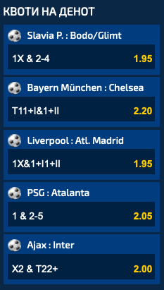 Од фудбалерите на Славија Прага се очекува да не загубат на домашен терен од Бодо Глимт, а доколку успеат во тоа, но и ако на натпреварот има помеѓу два и четири гола, квотата од 1.95 ќе биде добитна.
