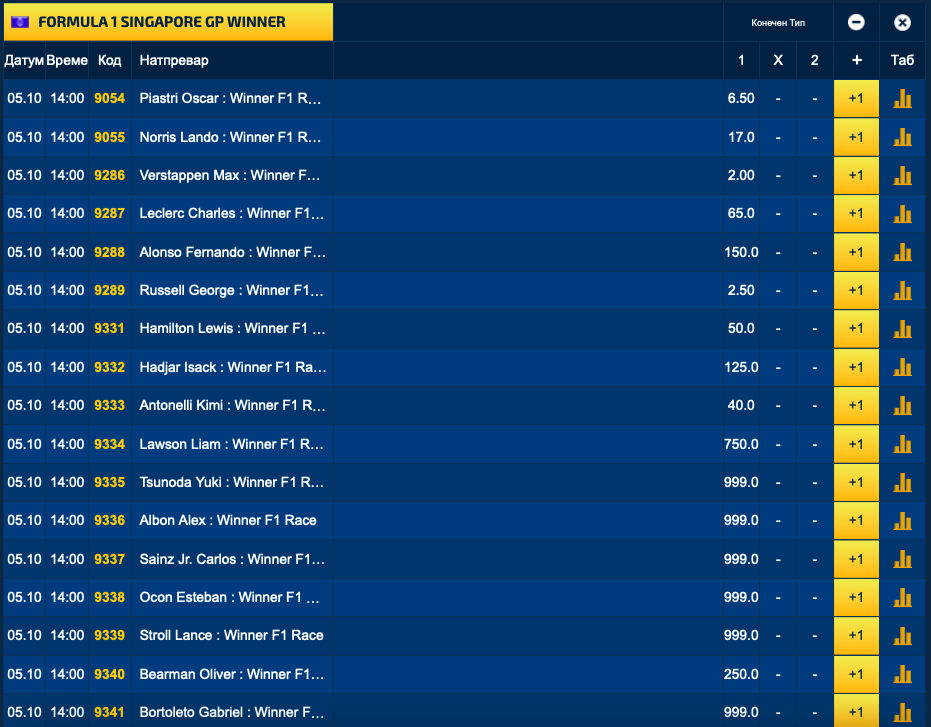 Главен фаворит за победата со квота од 2.00 е Макс Ферстапен, кој ќе стартува од првиот ред, но од втората позиција. Веднаш позади него со квота од 2.50 за победа е најдобриот од квалификациите, Џорџ Расел, а трет фаворит е Оскар Пјастри со квота 6.50. Сите останати возачи имаат двоцифрена квота – Ландо Норис (17.00), Кими Антонели (40.00), Луис Хамилтон (50.00), Шарл Леклер (65.00) …