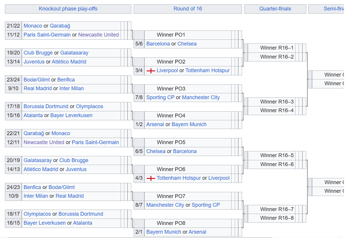 Реал сега ќе игра со Бенфика или со Бодо/Глимт. Јуентус во првата нокаут фаза ќе чека еден од Бриж и Галатасарај, додека ПСЖ за противник ќе го добие Карабах или Монако.