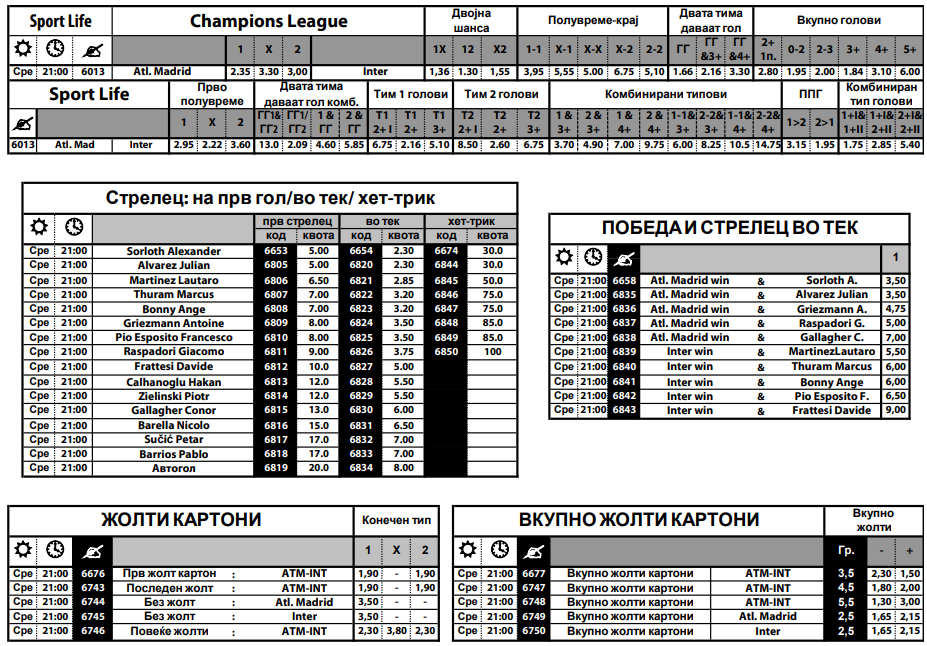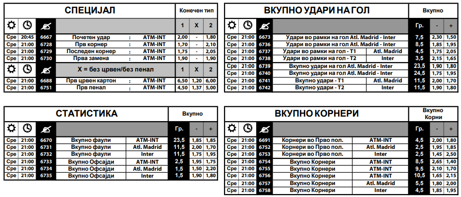Атлетико Мадрид е во серија од пет победи по ред во сите натпреварувања и сигурно со голем оптимизам го пречекуваат Интер, кој е со перфектни четири победи во Лигта на шампионите сезонава.