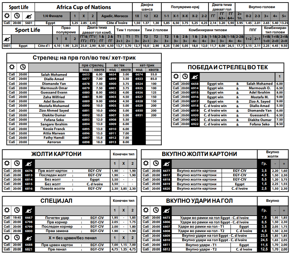 Египет предводен од Мохамед Салах ќе има многу тешка задача да го елиминира Брегот на Слонова коска. Салах е главен фаворит за стрелец на првиот гол и стрелец во тек на средбата, а тука е и ѕвездата на Манчестер јунајтед Диало Амад во дресот на Брегот на СК. Интересни се и комбинациите за стрелец на погодок и победник на меч.