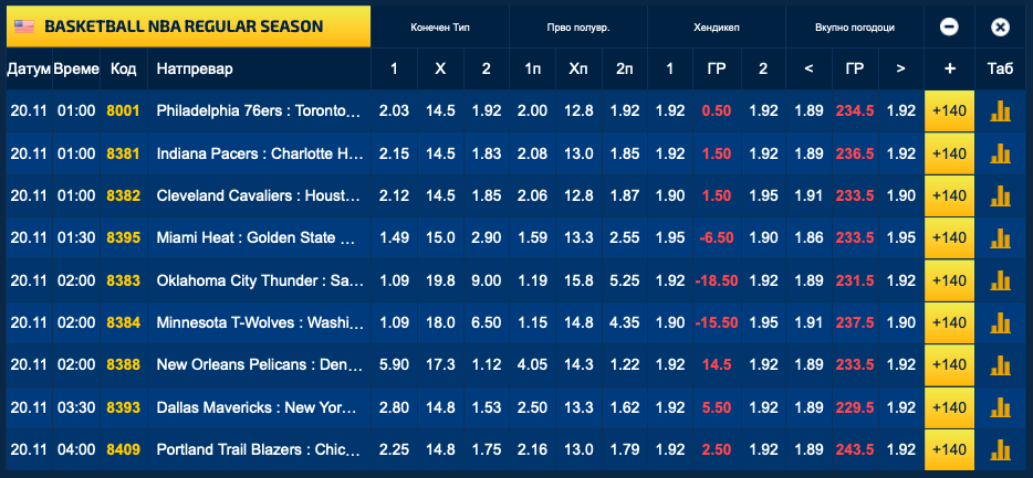 Оклахома и Минесота се апсолутни фаворити за победите против Сакраменто, односно Вашингтон, а квотата им е само 1.09. Мајами има поголема квота за домашна победа, 1.49, додека на сите останатите натпревари фаворити се гостите.