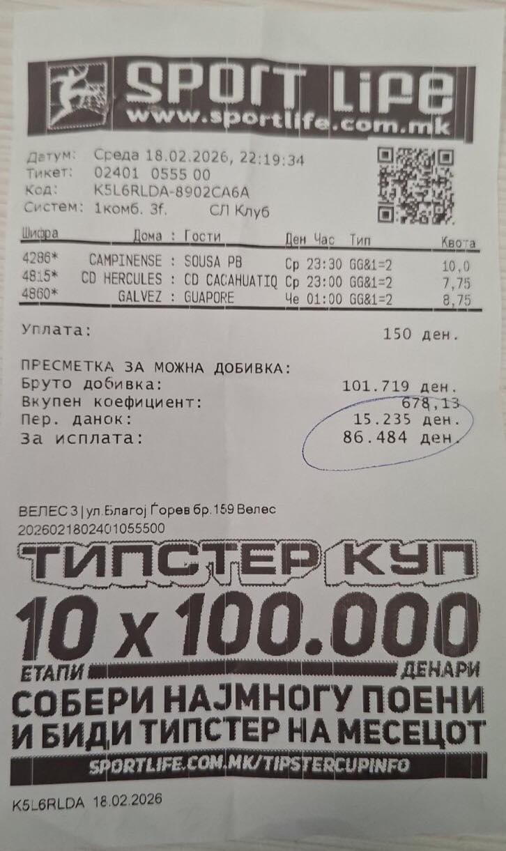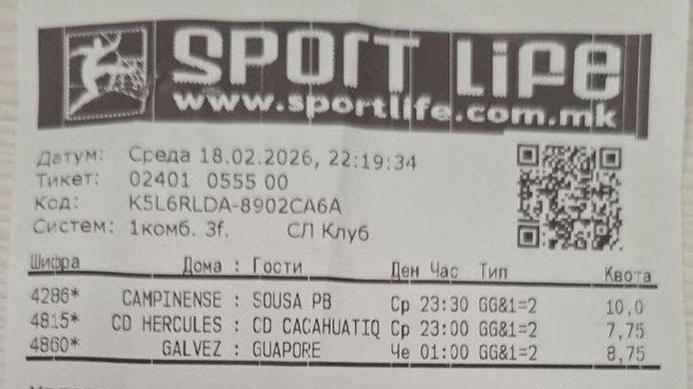 Овој велешанец синоќа во Sport Life уплатил 150 денари на три меча кои се играа во Средна и Јужна Америка и има бруто-добивка од над 100.000 денари бидејќи точно ги прогнозираше исходите на овие дуели кои завршија по полноќ.