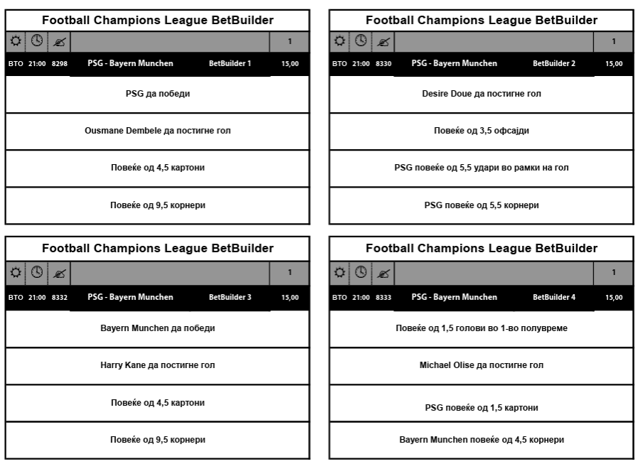 Бет билдерите на Spоrt Life за натпреварот ПСЖ – Баерн Минхен носат комбинации со квоти од 15.0, а имате избор – некои билдери го фаворизираат домашниот, некои гостинскиот тим. Кај сите за супер добивка потребно е да се исполнат само по четири услови.