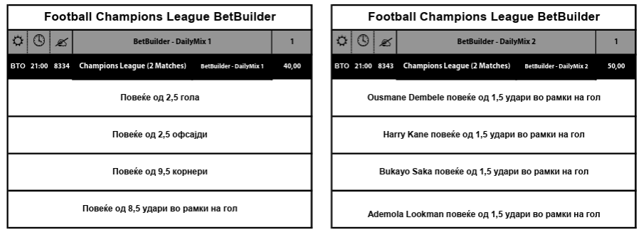 Тука се и две билдерски комбинации со огромни квоти од 40 и 50, а таму се вклучени игри и играчи и од утрешното полуфинале во Лигата на шампионите. Така, за да ви биде добитна квота од 50.0, треба Дембеле од ПСЖ, Кејн од Баерн, Сака од Арсенал и Лукман од Атлетико да имаат два или повеќе шутеви во рамките на голот.