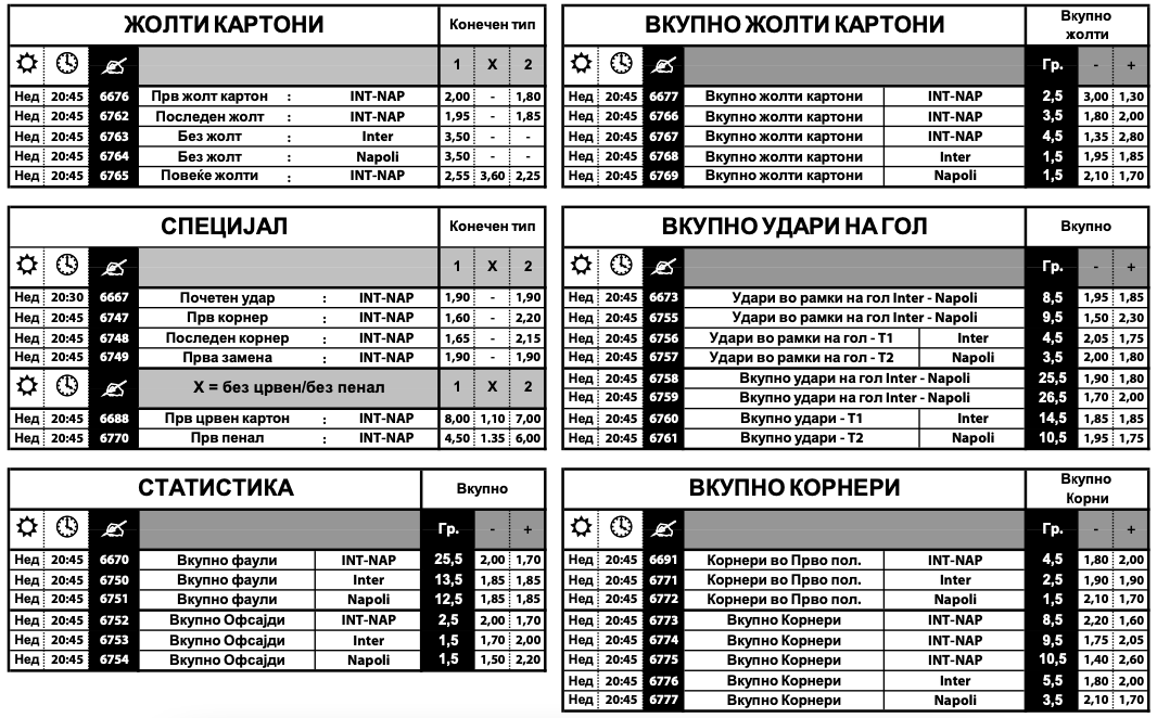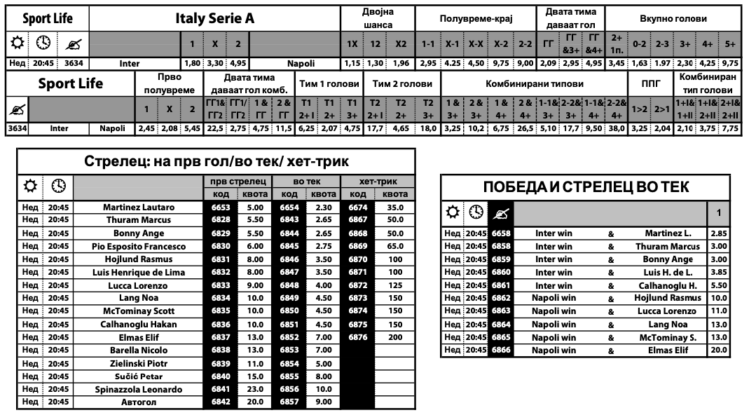Во специјалната понуда на Sport Life има и стотици игри и комбинации и за статистичките елементи, како што се корнери, картони, удари во рамки на гол, замени, офсајди … Комплетната понуда може да ја најдете на следниот ЛИНК.