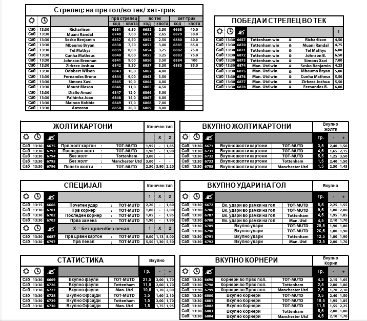 За битката во Лондон, главни кандидати за прв стрелец се Ричарлисон и Рандал Коло Муани од домашниот, а Бенјамин Шешко и Брајан Мбеумо од гостинскиот тим. Одлична квота има и за Бруно Фернандеш кој обично ги шутира пеналите за Јунајтед, па ако верувате дека ќе има пенал за Црвените ѓаволи, може да одиграте на Бруно дека ќе биде стрелец или да уплатите дека ќе има пенал за гостите, квотите се феноменални.