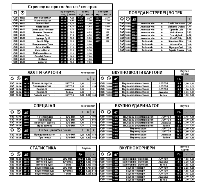 На градското дерби во Торино, Јувентус е апсолутен фаворит, па затоа и главни кандидати за стрелци се играчи на Старата дама како Давид, Влаховиќ, Опенда, Јилдиз и Консеисао. Најголеми шанси за стрелец на гол за Торино му се даваат на Џовани Симеоне.