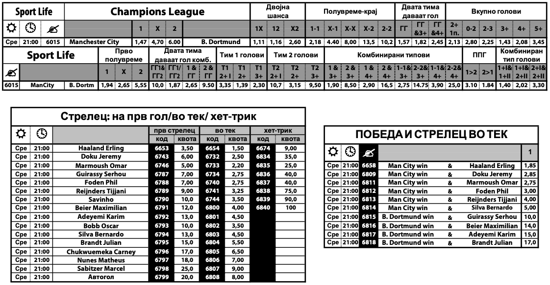 Граѓаните се фаворити со квота за победа од 1.47, но во Sport Life оваа квота може да ја зголемите доколку ја искомбинирате со стрелец. Така победа на Сити и гол на Халанд има квота од 1.85, комбинација со Доку има квота од 2.85, а со Мармуш – 2.75.