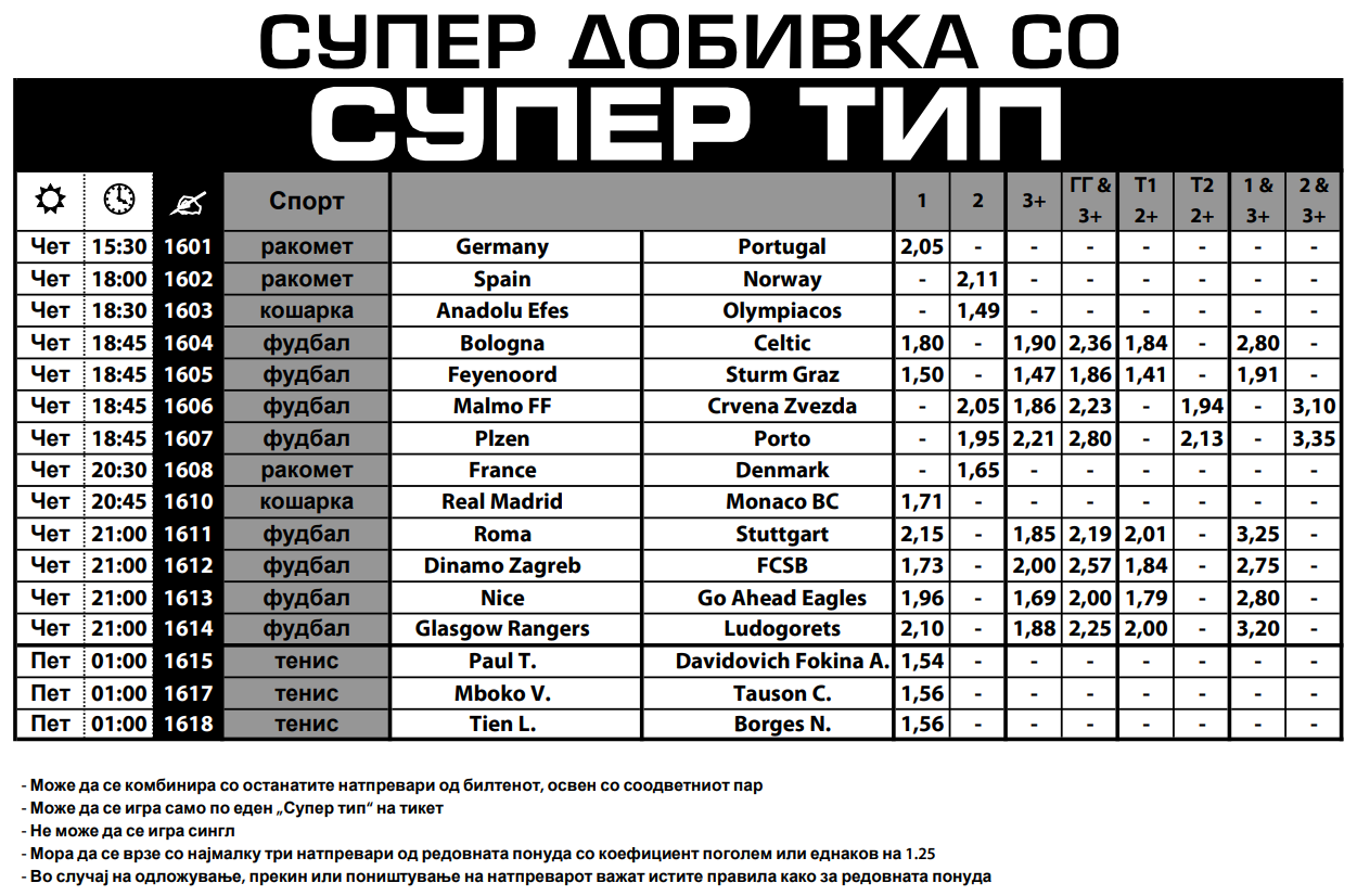 Vо денешната понуда на Супер типот во Sport Life има ракомет, кошарка, тенис и фудбал. На Европското првенство во ракомет, Германија да слави над Португалија е со квота од 2.05, а дури 2.11 се дава за Норвешка да слави над Шпанија. Според квотите, Данска е фаворит за победа над Франција и квотата е 1.65.