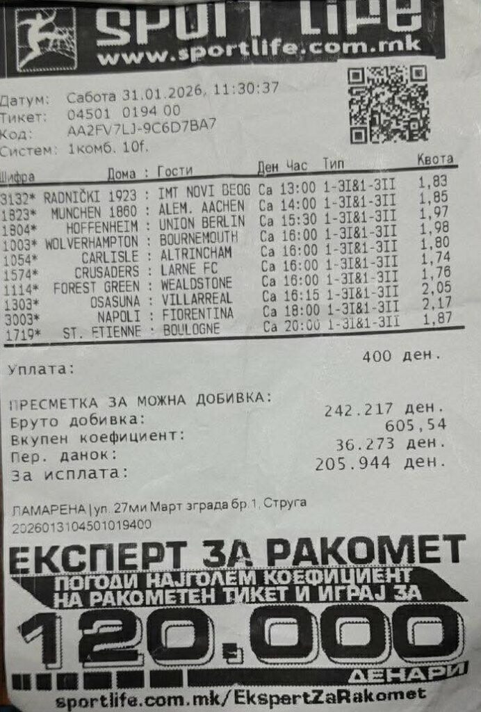 Стружанец во вистински момент, пред последниот натпревар, почувствува дека треба да искористи „кеш аут“ и да си подигне околу 2.000 евра (112.262 денари) и не погреши, затоа што последниот натпревар на тикетот уплатен со 400 денари во Sport Life, не излезе.