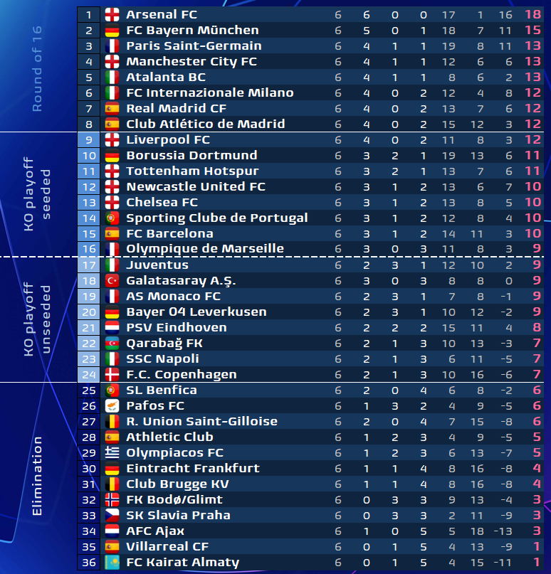 Кога сега би завршил лигашкиот дел, во осминафинале директно би влегле и Интер, Реал Мадрид и Атлетико Мадрид.