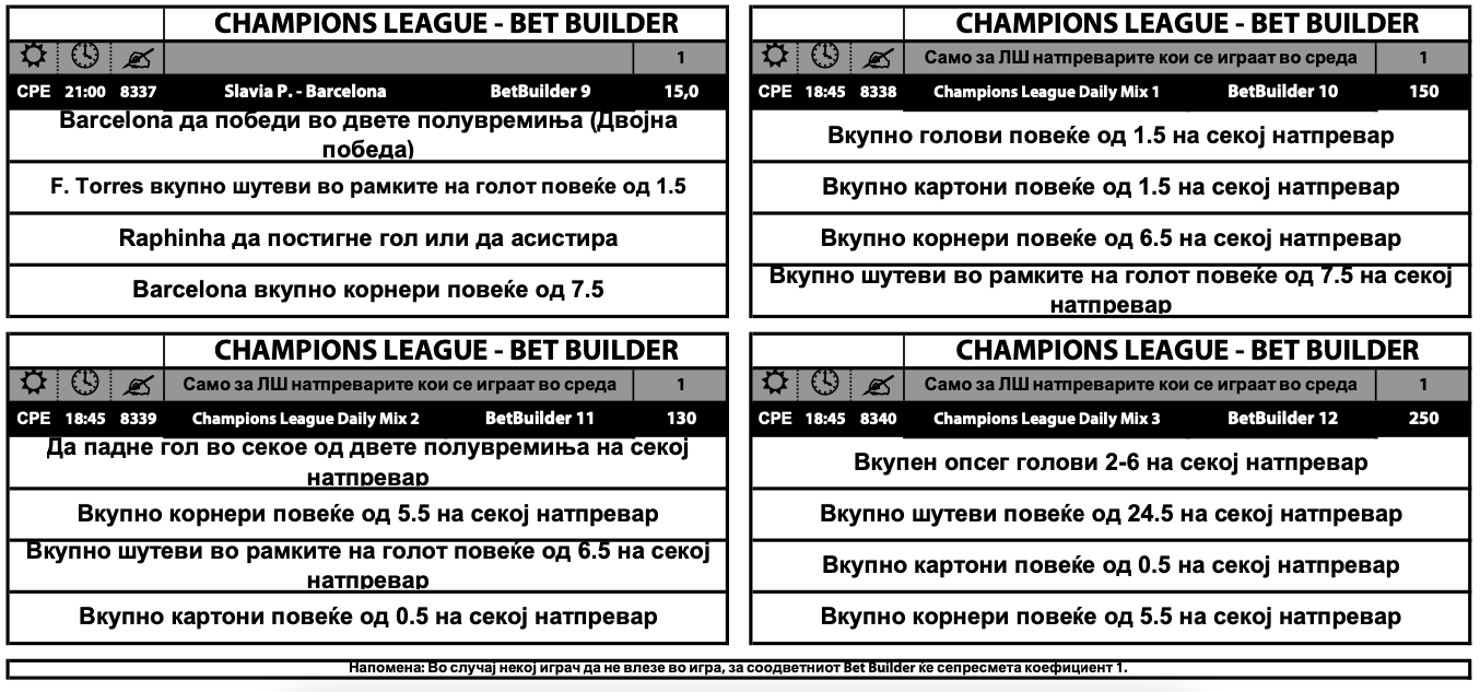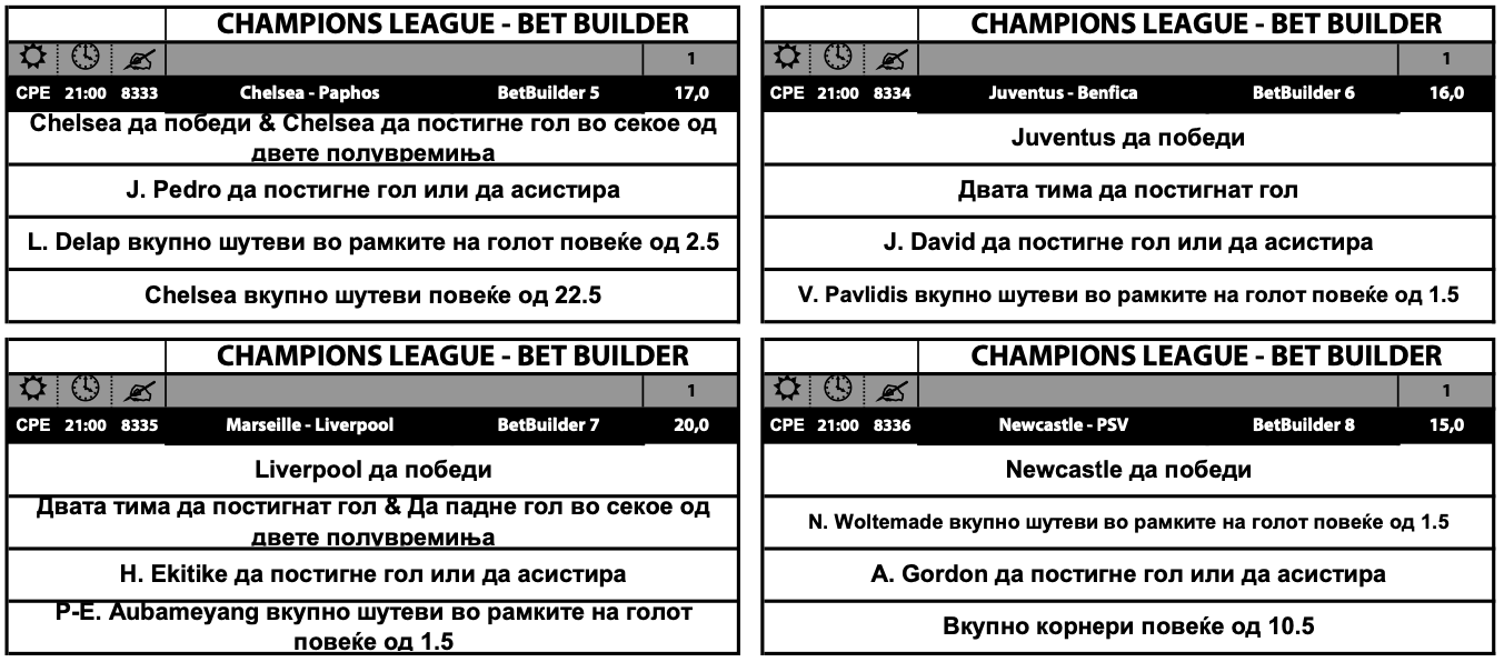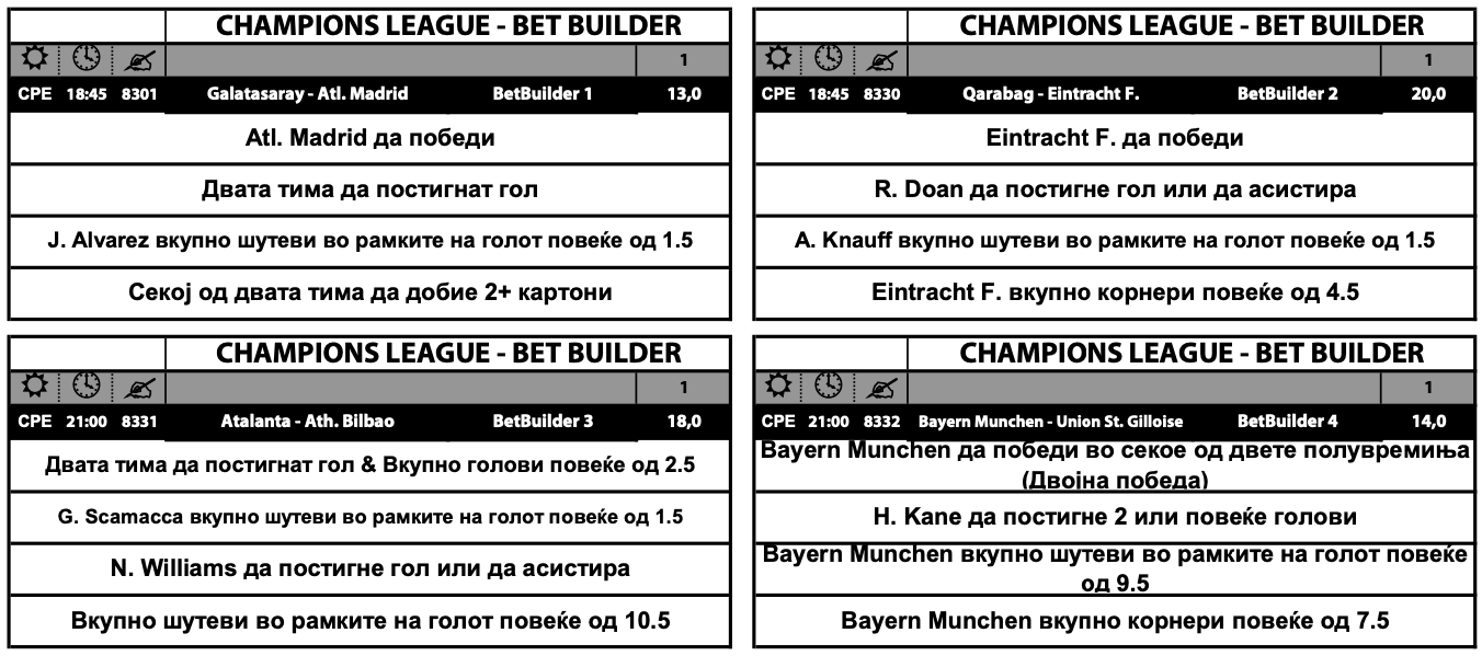 Седмото коло од Лигата на шампионите ќе биде комплетирано вечерва со девет меча, а за секој од нив во Бет билдерот има по една опција.