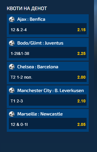 Ако се мислите што да одиграте за Манчестер сити – Баер Леверкузен, можеби од помош ќе ви биде предлогот со квота 2.15 Сити да постигне два или три гола на мечот.