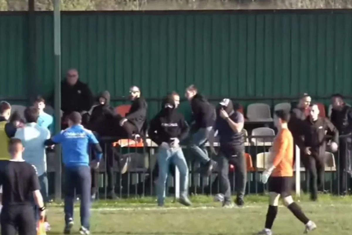 Шокантни сцени доаѓаат од еден натпревар во пониските лиги на Србија, каде што мечот се претвори во целосен хаос откако група хулигани влетаа на теренот и ги нападнаа играчите и стручниот штаб на домашниот тим.