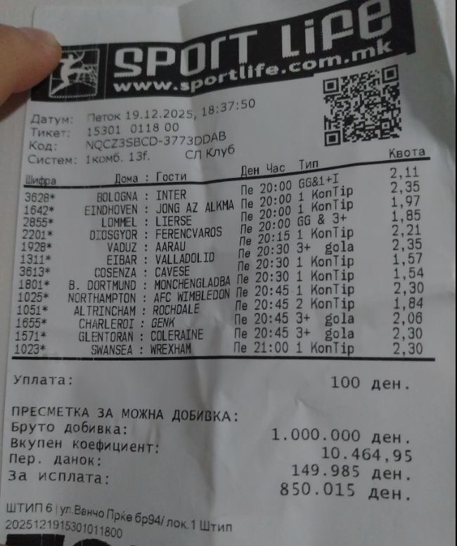 Од 13-те парови на тикетот кој го уплатил во Sport Life, точно го прогнозирал исходот на 12, а падна само на ДВТК Диошѓер – Ференцварош каде типувал ГГ и 3+, а средбата заврши со победа на гостите од 1-0. За милион му требаа уште по еден гол во двете мрежи.