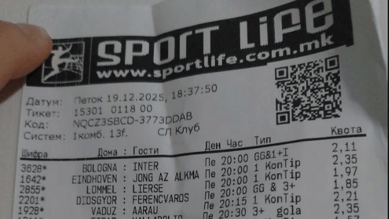 Од 13-те парови на тикетот кој го уплатил во Sport Life, точно го прогнозирал исходот на 12, а падна само на ДВТК Диошѓер – Ференцварош каде типувал ГГ и 3+, а средбата заврши со победа на гостите од 1-0. За милион му требаа уште по еден гол во двете мрежи.