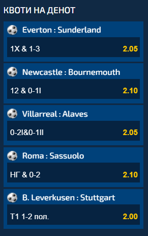 Пет интересни натпревари се дел од пондуата во Квоти на ден, а ако понудените комбинации се одиграат заедно на еден тикет, вкупниот коефициент кој ќе го добиете е 37.06.