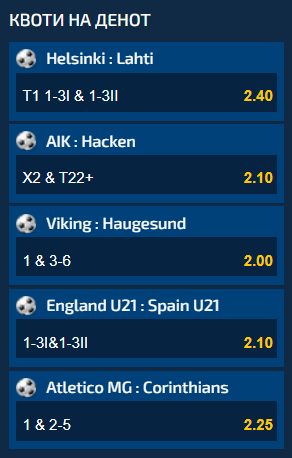 Петте предлози во Квоти на ден доколку ги одиграте заедно на еден тикет, ќе добиете вкупен коефицинет од 47.62. Прв на листата е дуелит Хелсинки – Лахти и тука треба да се очекуваат погодоци во мрежата на гостите. Хелсинки да постигне од 1-3 гола во првото и 1-3 гола во второто полувреме носи коефицинет 2.40.
