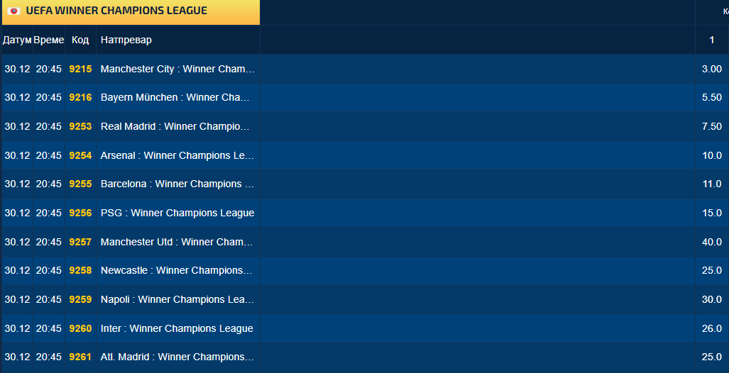 Пред почетокот на сезоната, квотата на Сити исто така беше 3.00, но паднаа квотите на Баерн, Реал, Арсенал, Барса и ПСЖ, а пораснаа квотите за клубови како Манчестер јунајтед и Наполи. За Јунајтед сега квотата е 40.0, а пред почетокот на сезоната беше 23.0.