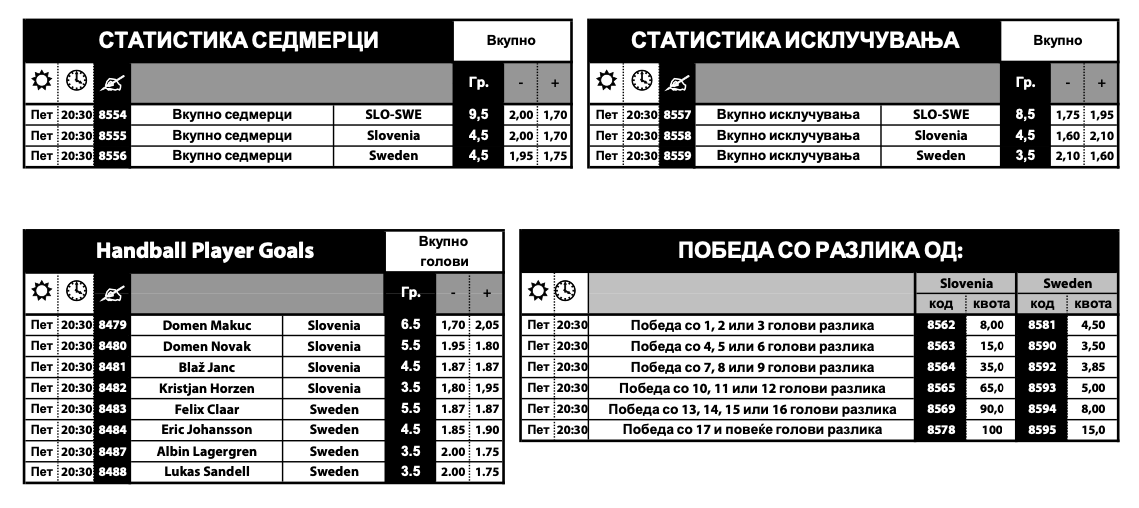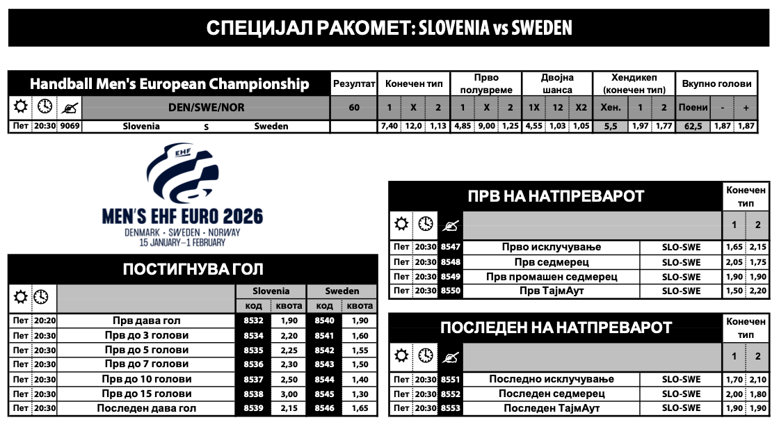 Сега, ако се погледнат квотите во Sport Life, Шведска е голем фаворит, веројатно и поради домашниот терен, па квотата за нивна победа е 1.13. Триумф на Словенија има квота од фантастични 7.40.