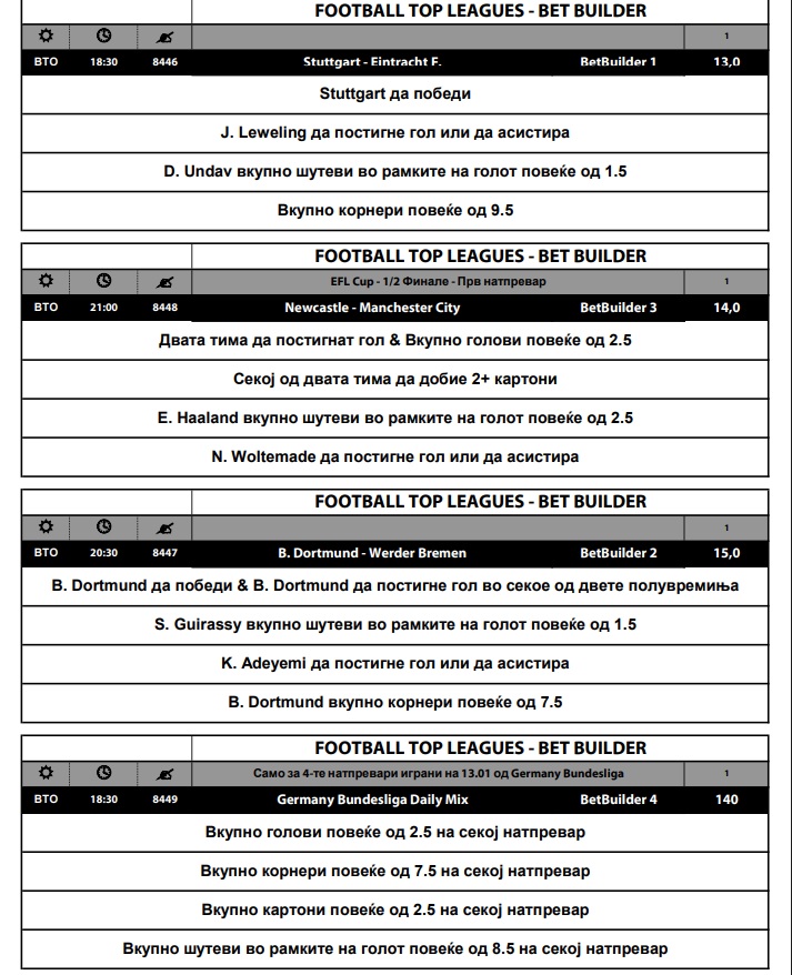 Покрај тоа, подготвени се и одделни Бет билдер предлози за натпреварите Штутгарт – Ајнтрахт Франкфурт, Борусија Дортмунд – Вердер и Њукасл – Манчестер сити.