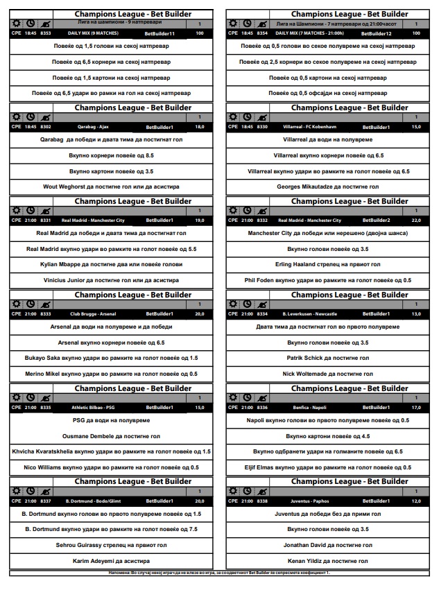 Во еден од двата предлога се вели да има најмалку два гола, седум корнери, два жолти картони и седум удари во рамките на гол – и тоа на сите девет денешни натпревари од Лигата на шампионите.